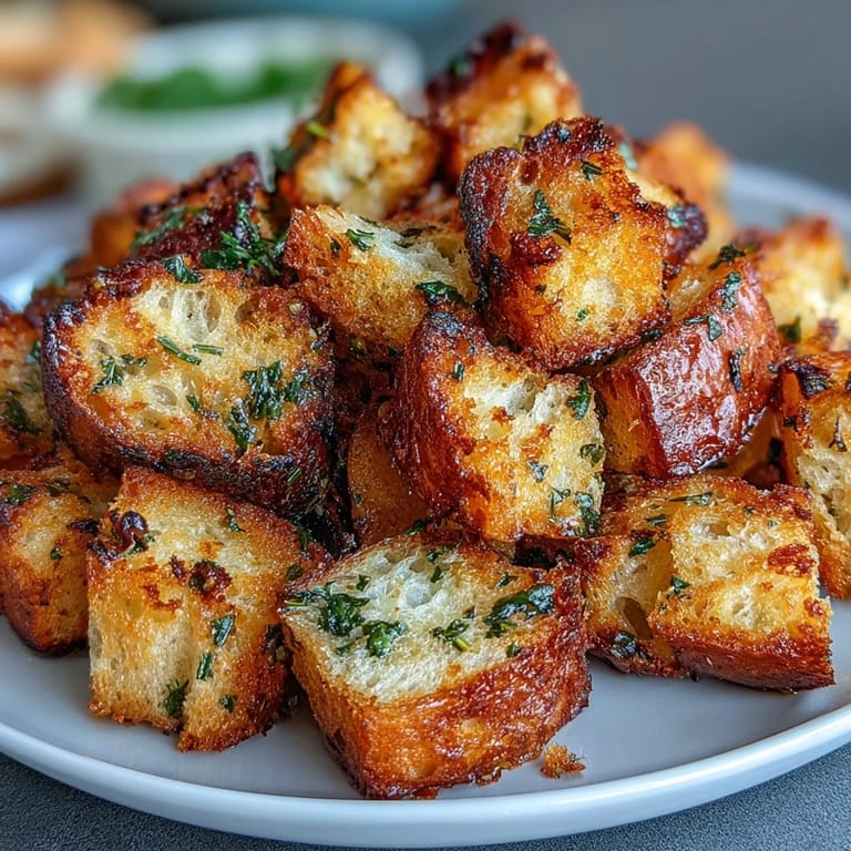 Save My air fryer sits on the counter like a trusty friend, and one afternoon while hunting for ways to use up a slightly stale sourdough loaf, I discovered these golden little nuggets could transform a boring salad into something I actually wanted to eat. The garlic hit me first when they came out—sharp and toasted, nothing like the raw bite you'd expect. I tossed them onto a simple green salad that night and couldn't stop reaching for more, and suddenly this humble side dish became the reason people asked for seconds.