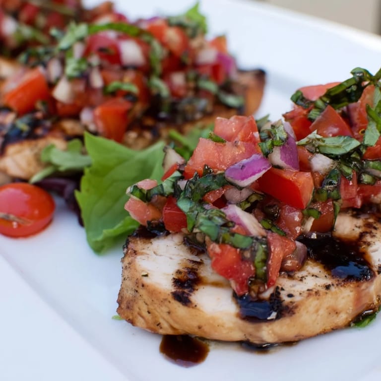 A crisp Sauvignon Blanc or Pinot Grigio complements the fresh tomato-basil flavors beautifully. These lighter white wines pair perfectly with grilled chicken and the acidic brightness of balsamic vinegar in the topping.