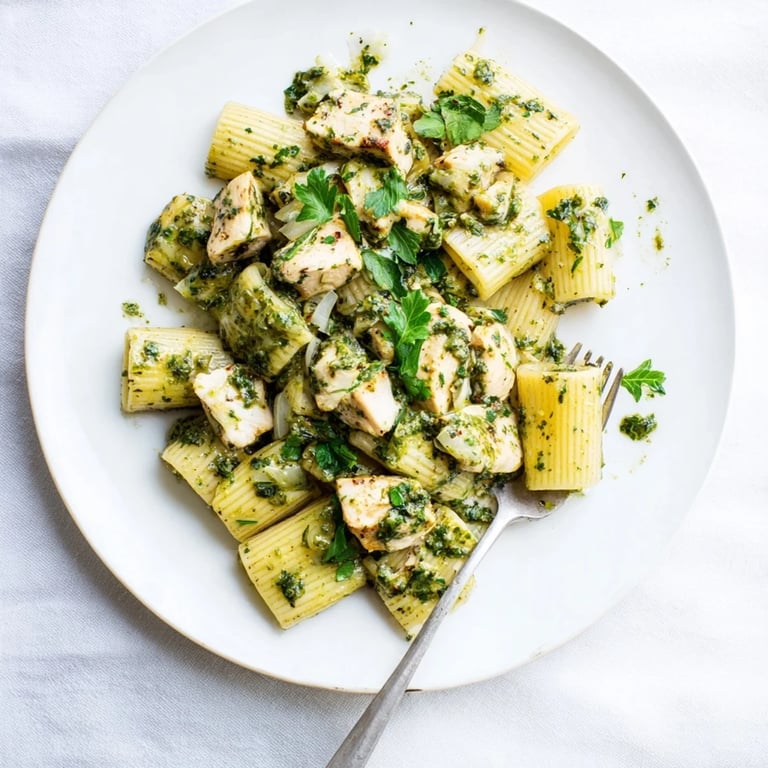 Save The secret to this dish lies in the zesty chimichurri, which serves as a bright, garlic-infused dressing that perfectly coats the chicken and pasta. It is a masterclass in using simple, fresh ingredients to create a gourmet fusion meal that is both light and filling.