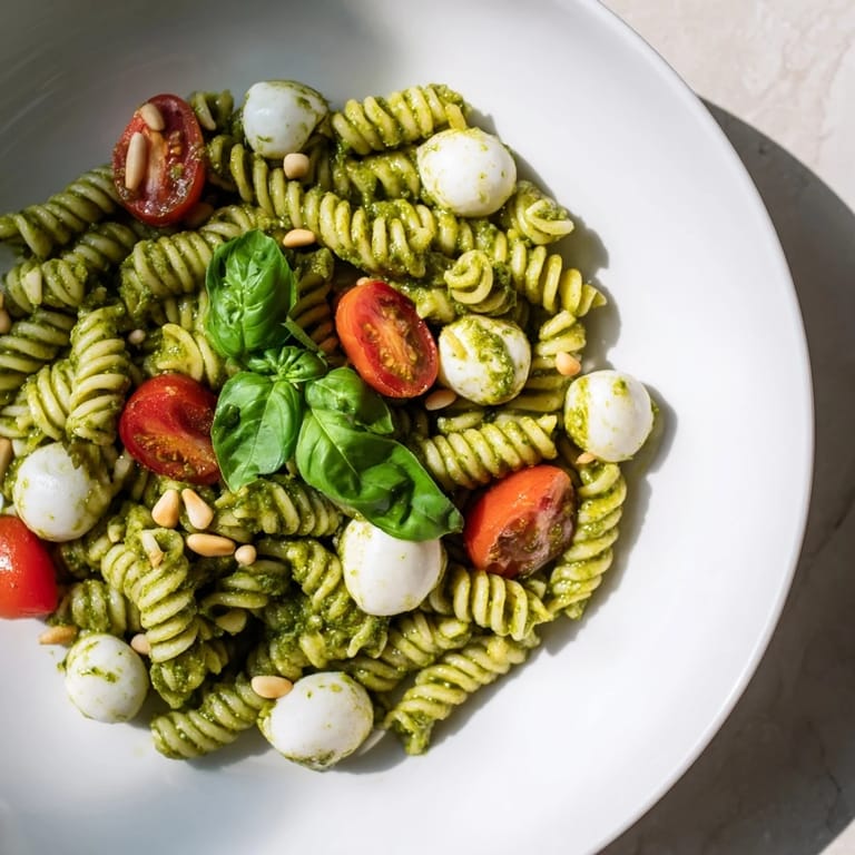 Save A vibrant, refreshing pasta salad featuring tender pasta, creamy mozzarella, juicy cherry tomatoes, and aromatic basil pesto—perfect for picnics or light lunches.