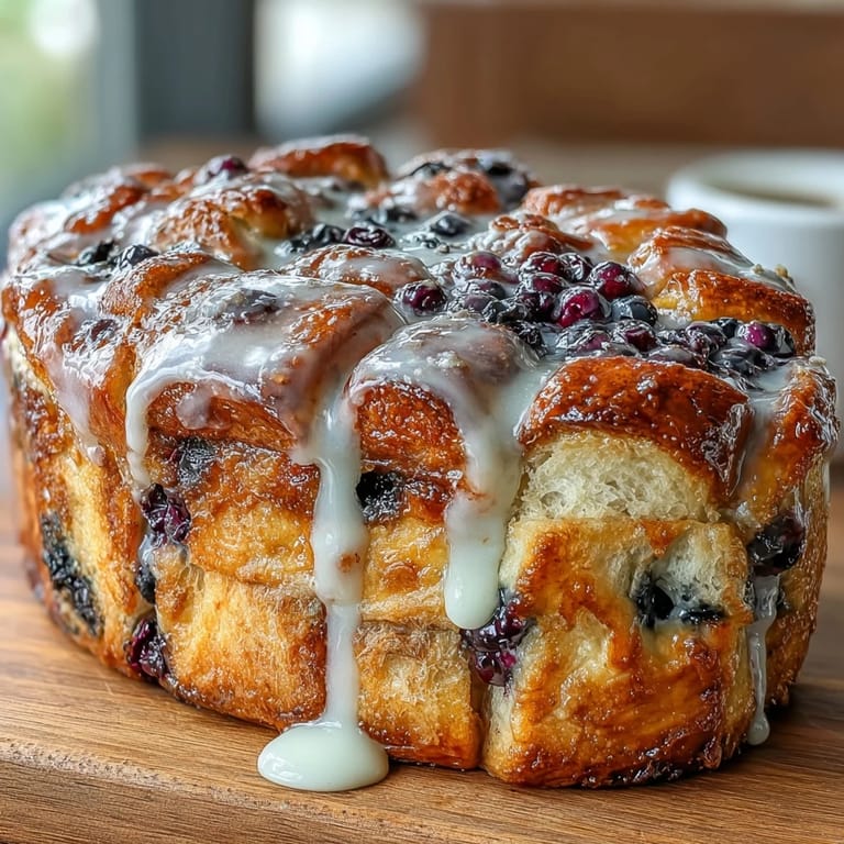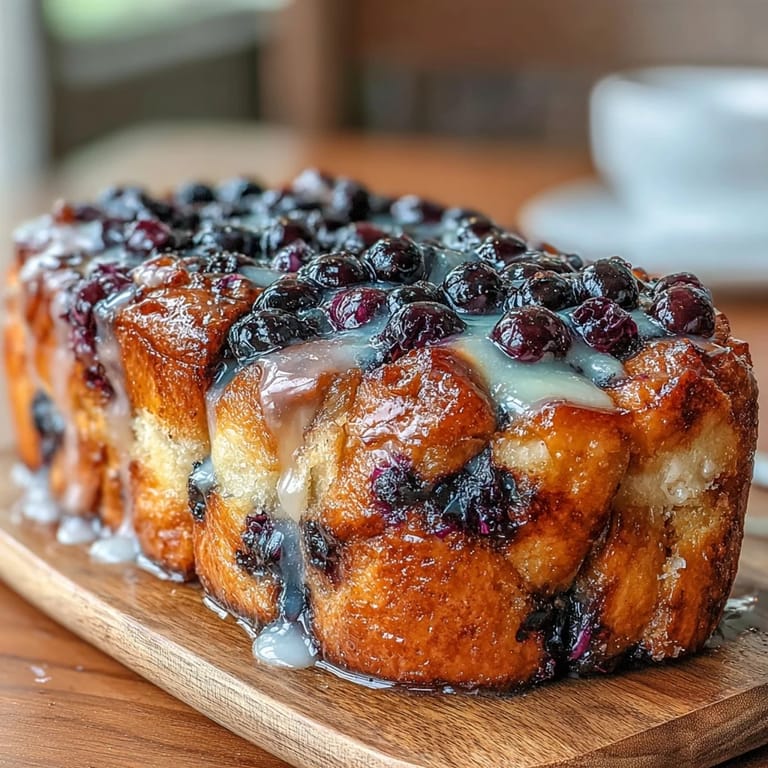 I made this for a Sunday brunch when my sister was visiting with her new partner, and I watched them both go quiet for a moment after the first bite—that specific quiet that means food just did something right. The bread had cooled just enough that it was still warm, the glaze was still a little sticky, and when they pulled apart those golden squares, the blueberries released this subtle jammy sweetness. It became the thing they asked about for weeks, and honestly, it became the thing I knew I had to perfect.