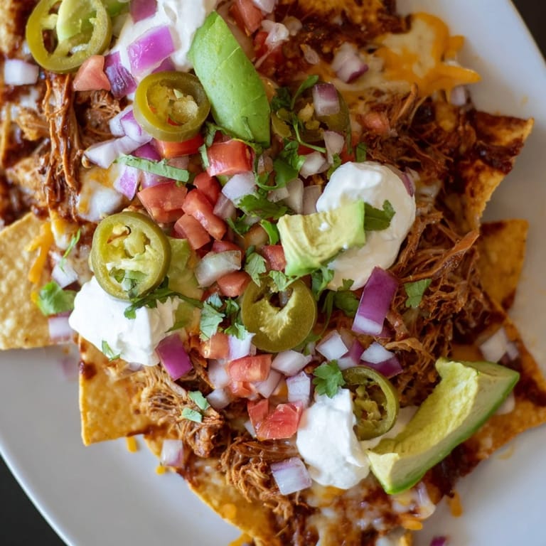 Save Nachos have a way of sneaking into moments when you least expect them to matter. I was reheating leftover pulled pork one evening, standing at the stove with no real plan, when it hit me—why not pile it onto chips with melted cheese? What started as kitchen improvisation became the thing everyone asks me to bring to gatherings. There's something almost magic about the contrast: crispy chips softening under warm queso, tender pork, the bite of jalapeños, and that cooling dollop of sour cream all working together.