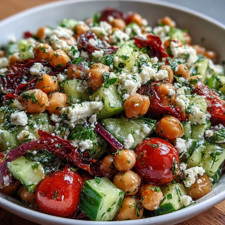 Save There's something magical about throwing together a salad when you have nothing but fresh vegetables and pantry staples. My neighbor handed me a bag of cucumber and tomatoes from her garden one afternoon, and instead of overthinking it, I grabbed a can of chickpeas and started chopping. That simple act turned into this Mediterranean salad that somehow became the dish I make whenever I need to feel like I'm eating well without any fuss.