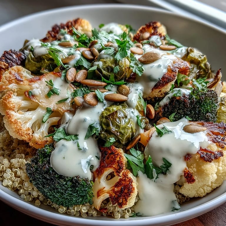 Save There's something about the smell of Brussels sprouts turning golden in a hot oven that makes everything else fade away. My kitchen fills with this nutty, almost caramelized sweetness, and suddenly I'm not just cooking dinner—I'm creating something that feels both simple and special. This roasted brassica bowl came together one autumn evening when I had a fridge full of vegetables and wanted something that didn't need a complicated recipe. The beauty of it is in the roasting: heat does most of the work while you prepare a silky tahini dressing that ties everything together.