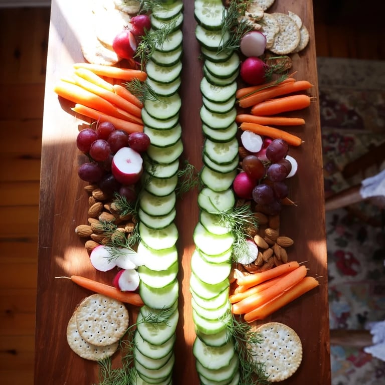 - At one end, start laying down cucumber slices as a base, slightly overlapping like roof tiles. Layer your crackers, then arrange carrots, radishes, grapes, and goat cheese rounds in a way that feels intentional but not rigid—tight enough to suggest care, loose enough to feel alive.